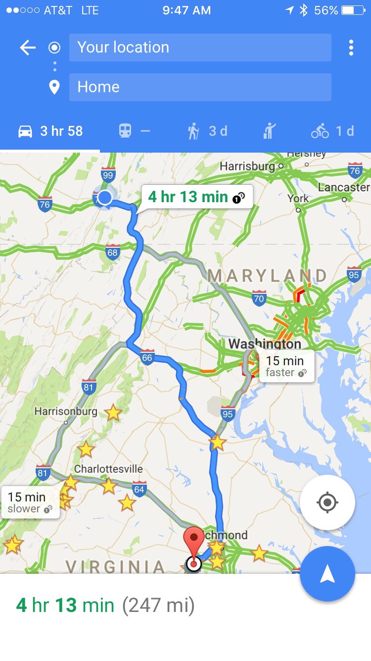 The next day, it was time to head home. The trip from central Michigan took longer than we expected, in part due to the ever-present construction in Toledo. We ended up getting a non-Motel 6 motel in Bedford, Pennsylvania, free of the WWI-era weaponized chlorine from the Traverse City motel, enabling Laura to wake up early enough for us to finish the trip the next day. We made it home fairly quickly in spite of some shenanigans from Google Maps.
